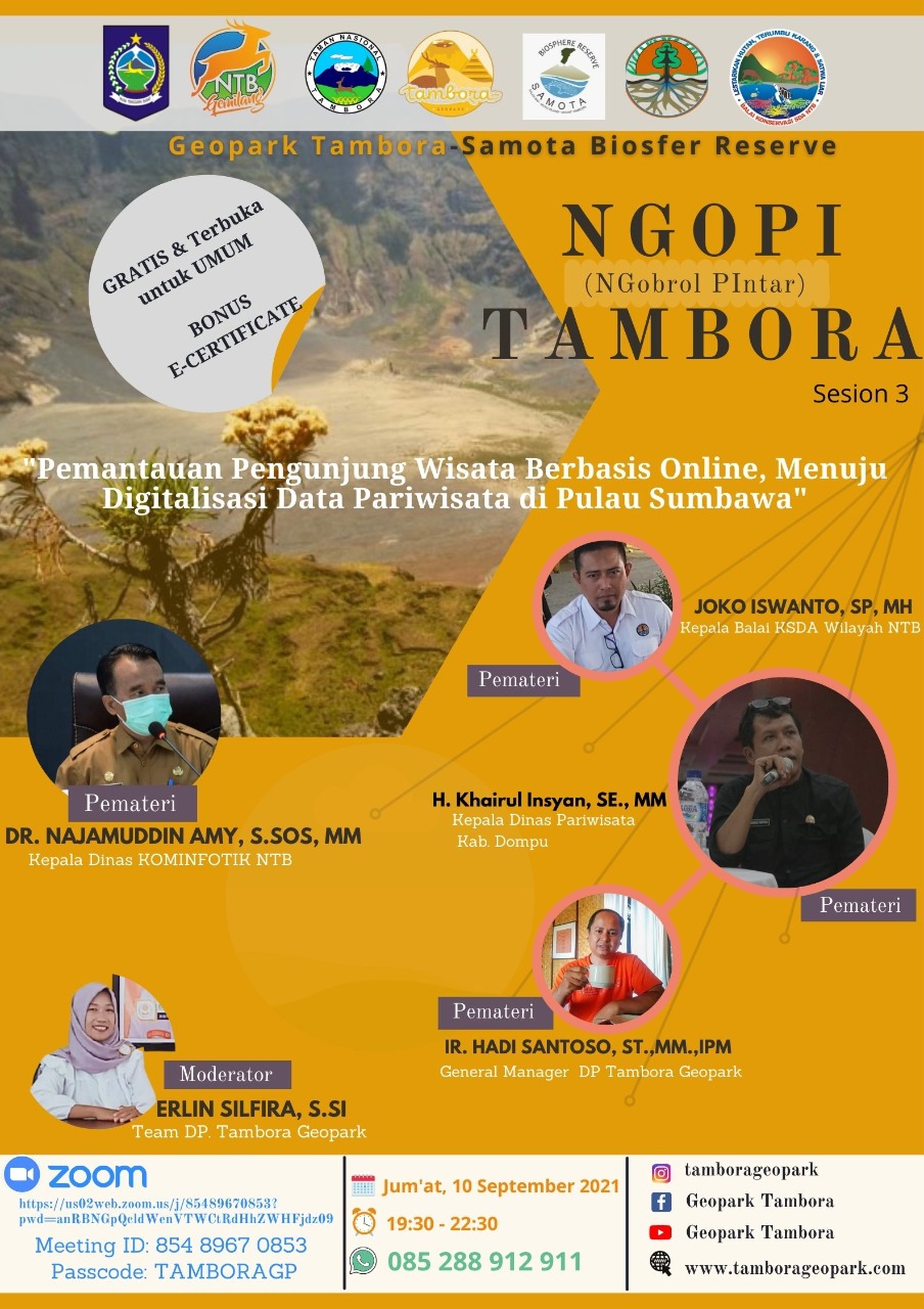 Dewan Pelaksana (DP) Geopark Tambora kembali menggelar webinar Ngopi (Ngobrol Pintar) Tambora. Pada session ke tiga ini mengambil tema “Pemantauan Pengunjung Wisata Berbasis Online, Menuju Digitalisasi Data Pariwisata di Pulau Sumbawa”.